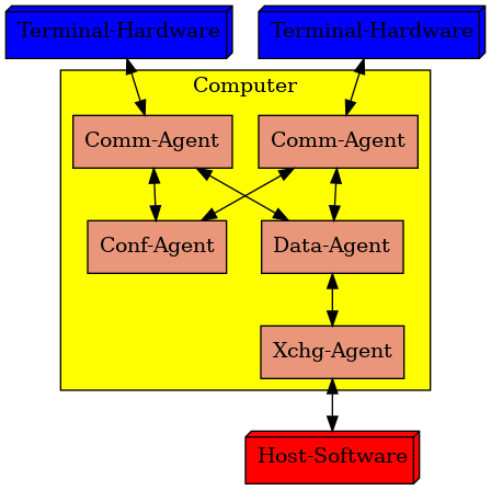 Sowohl die Programm-Komponenten untereinander als auch "menschliche" Benutzer benutzen das selbe CLI (=Command Line Interface) Interface über TCP/IP-Sockets.